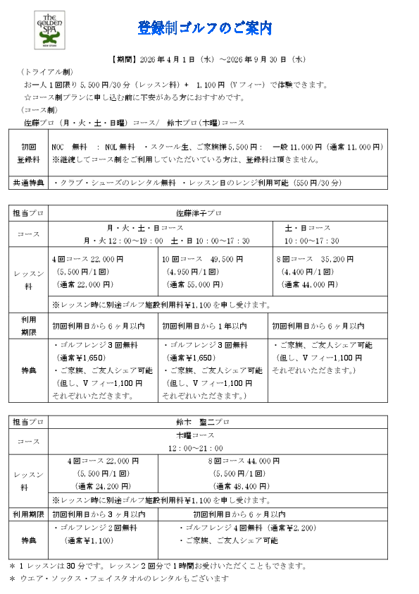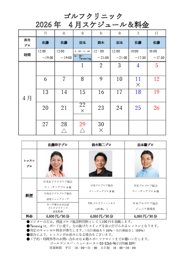 概要 料金・時間 ゴルフレッスン ゴルフレッスン レッスンプロ紹介 佐藤洋子プロ 日本女子プロゴルフ協会 ティーチングプロA級 岩本肇プロ 日本プロゴルフ協会 ティーチングプロA級 鈴木聖二プロ 日本プロゴルフ協会 ティーチングプロB級 ゴルフクリニック スケジュール 4月のスケジュール ゴルフレッスン生募集 ゴルフレッスンのご案内 【NOC・NOL会員限定】ゴルフスクール生募集 【NOC会員限定】 ゴルフスクール生募集! 2026年9月30日まで 【NOL会員限定】 ゴルフスクール生募集! 2026年9月30日まで 電話でのお問合せ 03-3265-9611