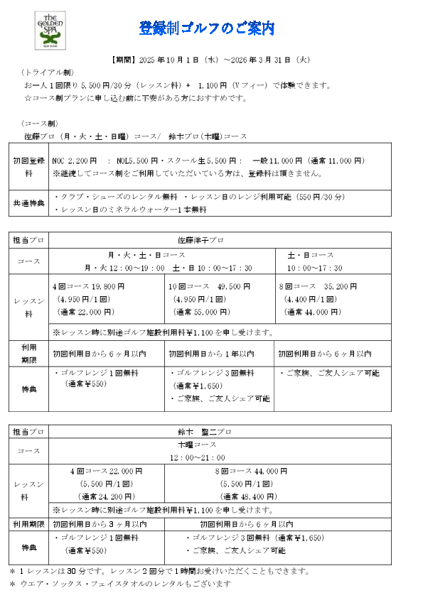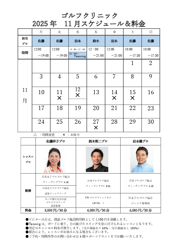 概要 料金・時間 ゴルフレッスン ゴルフレッスン レッスンプロ紹介 佐藤洋子プロ 日本女子プロゴルフ協会 ティーチングプロA級 岩本肇プロ 日本プロゴルフ協会 ティーチングプロA級 鈴木聖二プロ 日本プロゴルフ協会 ティーチングプロB級 ゴルフクリニック スケジュール 11月のスケジュール ゴルフレッスン生募集 ゴルフレッスンのご案内 【NOC・NOL会員限定】ゴルフスクール生募集 【NOC会員限定】 ゴルフスクール生募集! 2026年3月31日まで 【NOL会員限定】 ゴルフスクール生募集! 2026年3月31日まで 電話でのお問合せ 03-3265-9611
