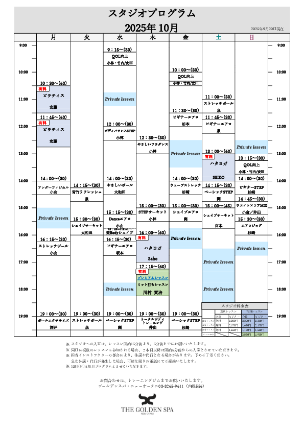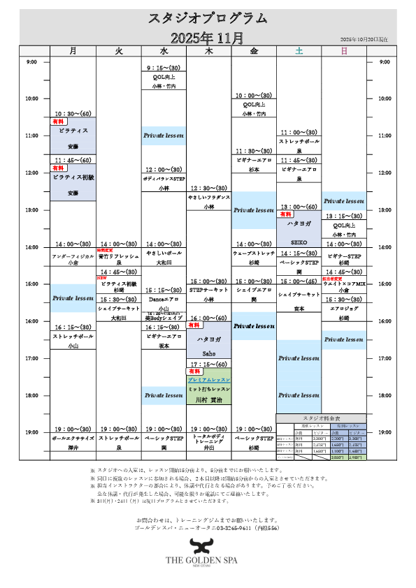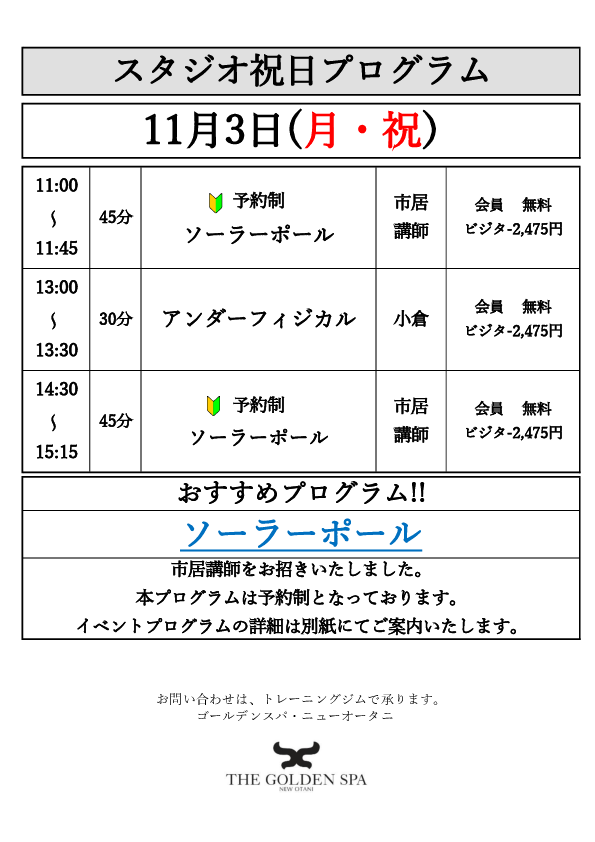 概要 料金・時間 プログラム スケジュール スタジオスケジュール スタジオプログラム 10月のスタジオプログラム 11月のスタジオプログラム スタジオ祝日プログラム(11月3日) 電話でのお問合せ 03-3265-9611
