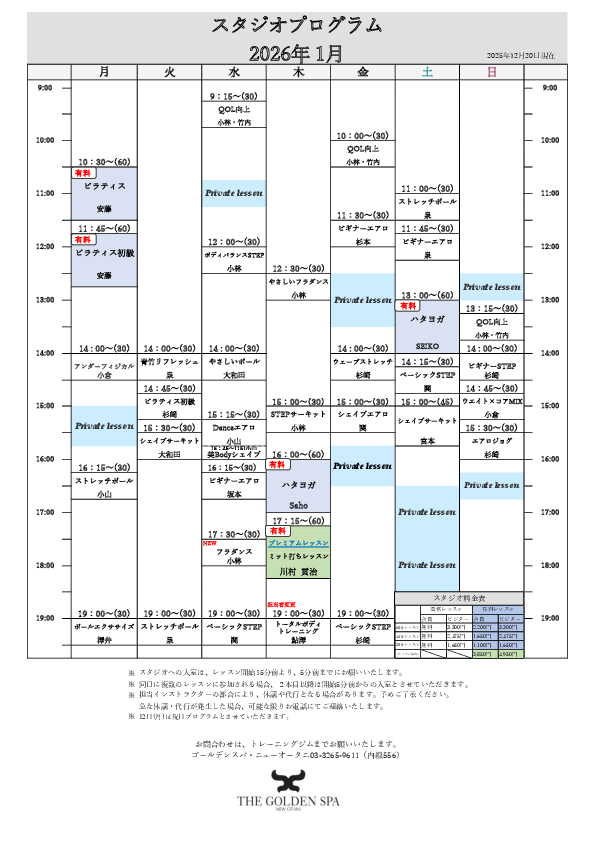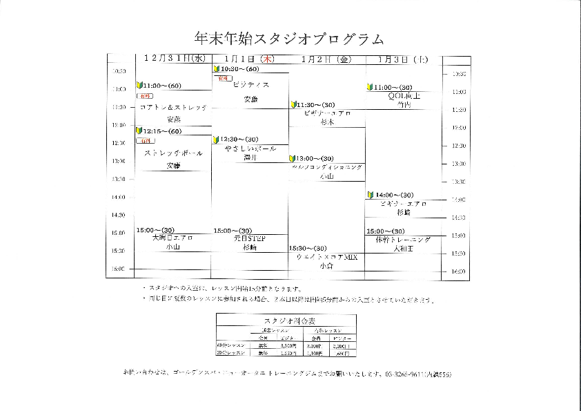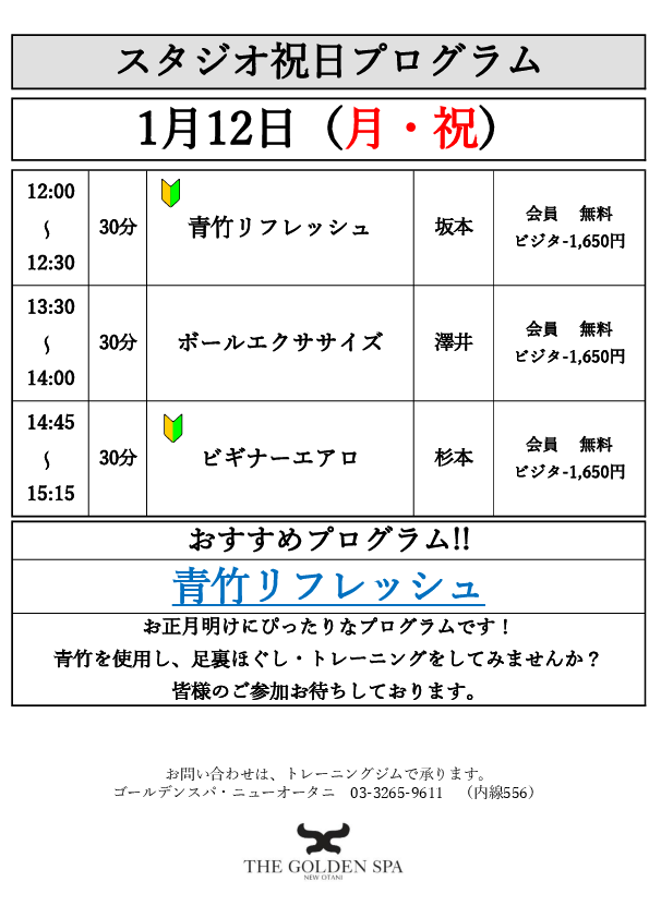 概要 料金・時間 プログラム スケジュール スタジオスケジュール スタジオプログラム 12月のスタジオプログラム 年末年始スタジオプログラム 1月のスタジオプログラム スタジオ祝日プログラム(1月12日) 電話でのお問合せ 03-3265-9611