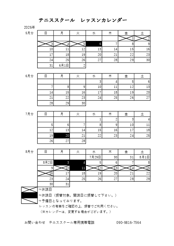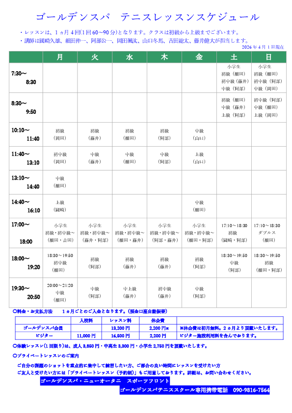 - 雨天やご都合により受講できない場合は、4ヵ月以内にご都合のよいクラスへお振り替えいただけます。